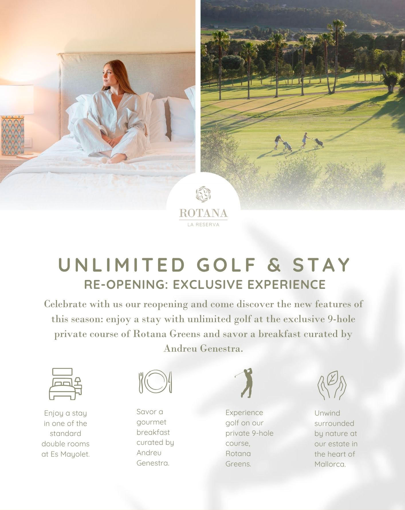 Just a few steps away from your stay, Rotana Greens unfolds: the only private golf course in Mallorca, conceived as an exclusive retreat for true lovers of the game, in its purest and most refined form. This 9-hole course, accessible only to guests of Reserva Rotana, fuses design and privacy in an environment that breathes natural elegance and avoids the superfluous.